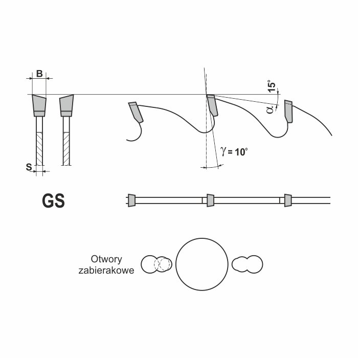 • tarcza z na przemian skośną geometrią zębów (GS) o kącie natarcia 10 stopni